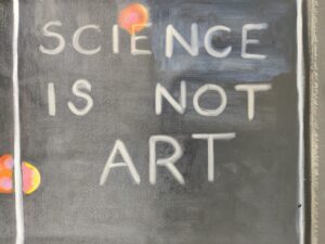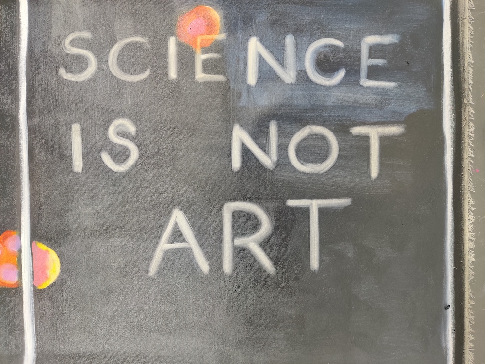 The painting was a response to a conversation with Dr Maria Dimitriadi, Reader in Molecular Genetics at University of Hertfordshire, who told me she and her new microscope were creating art. I said, it was not art. Just because it’s aesthetically appealing, doesn’t mean it’s art.