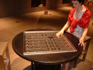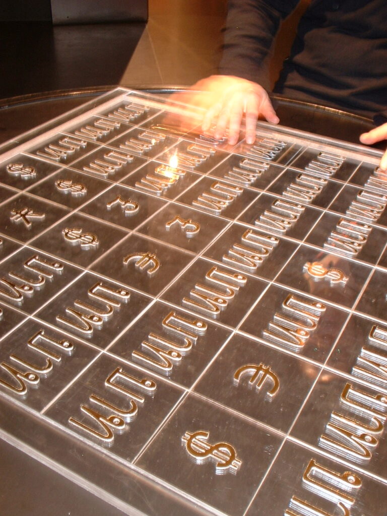 Trickledown+ (2005) is a shuffle puzzle where some pieces are stuck together and can’t move easily or at all and others move easily across the board. The pieces that can’t move have the word for Bhat, the currency of Thailand. The pieces that can glide across the surface are GBP (British pounds), USD (US and/or Australian Dollars), Euros and Japanese Yen.